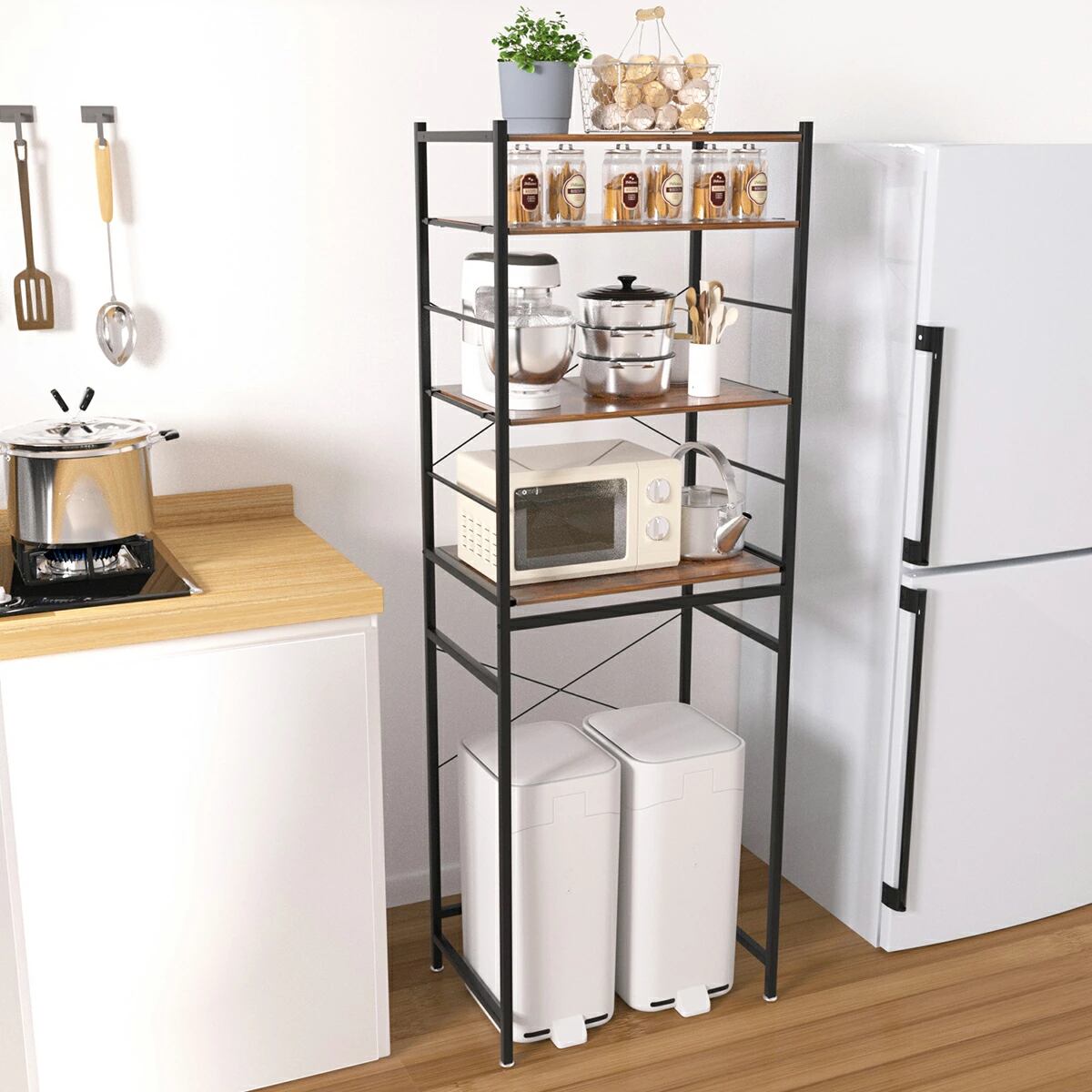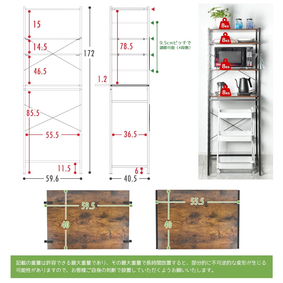 サイズはコンパクトですが、4段の棚は多様なキッチンアイテムを収納するのに最適です。ナチュラルな色合いの木目調で、シンプルながらもおしゃれな印象を与えます。どんなインテリアにもマッチする、便利なレンジ台です!