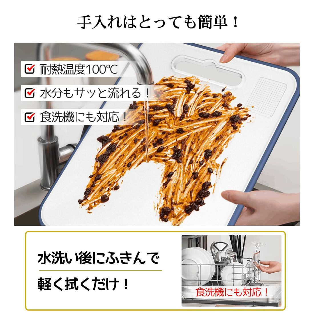 この両面まな板は、抗菌・防臭効果があるため、常に清潔に保つことができる優れたアイテムです。さらに、おろし金が付いているので、食材の下ごしらえがスムーズに行えます。頑丈で耐久性に優れた素材を使用しており、長く愛用できるデザインが魅力です。