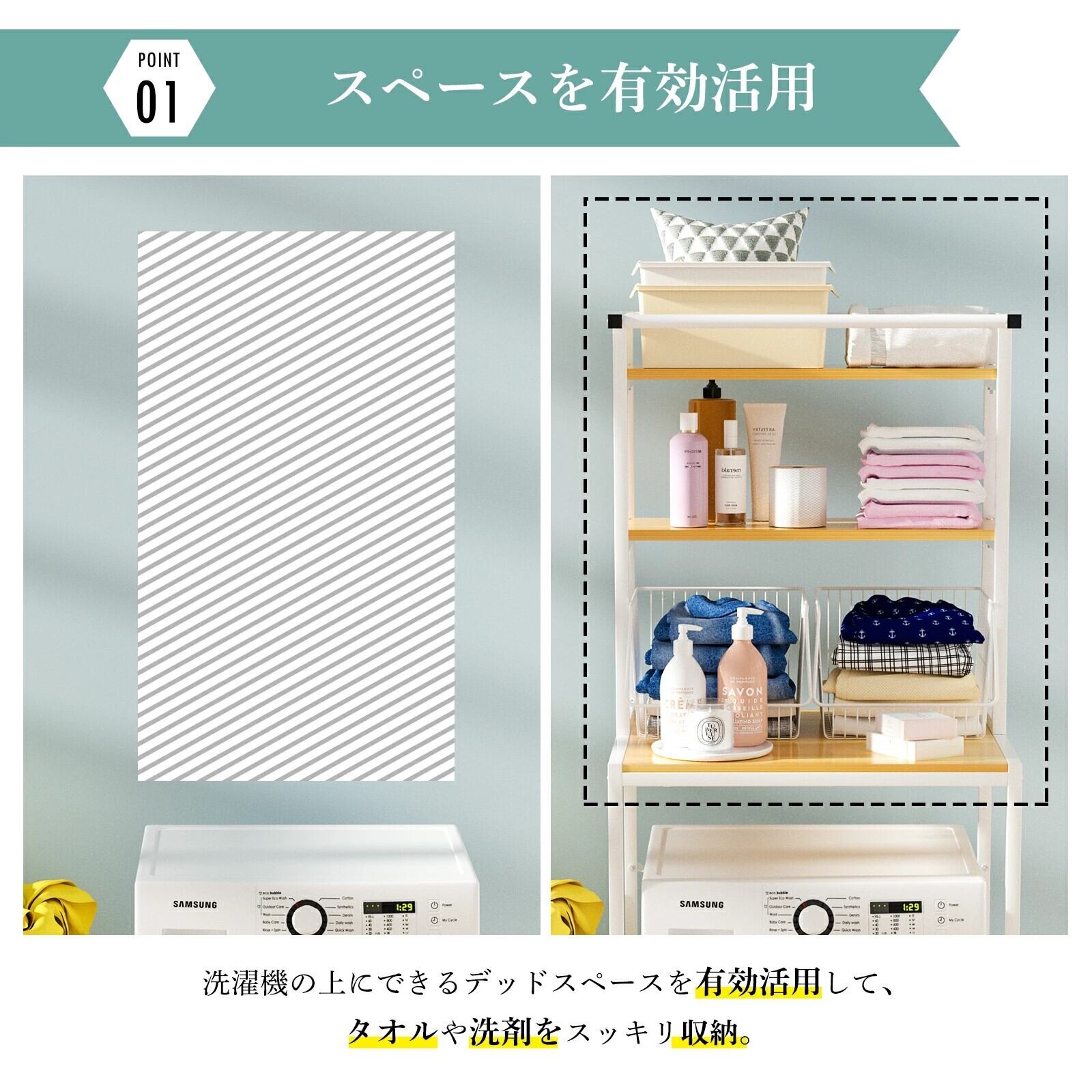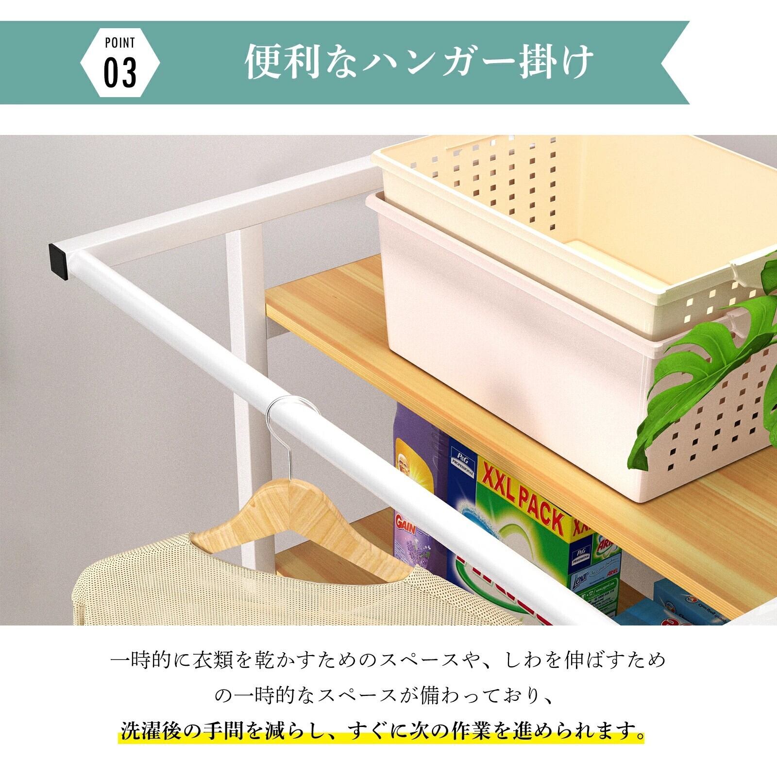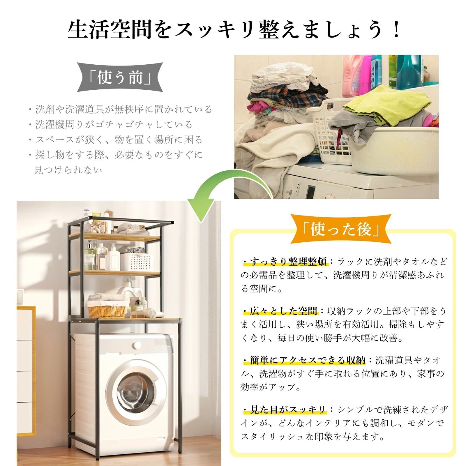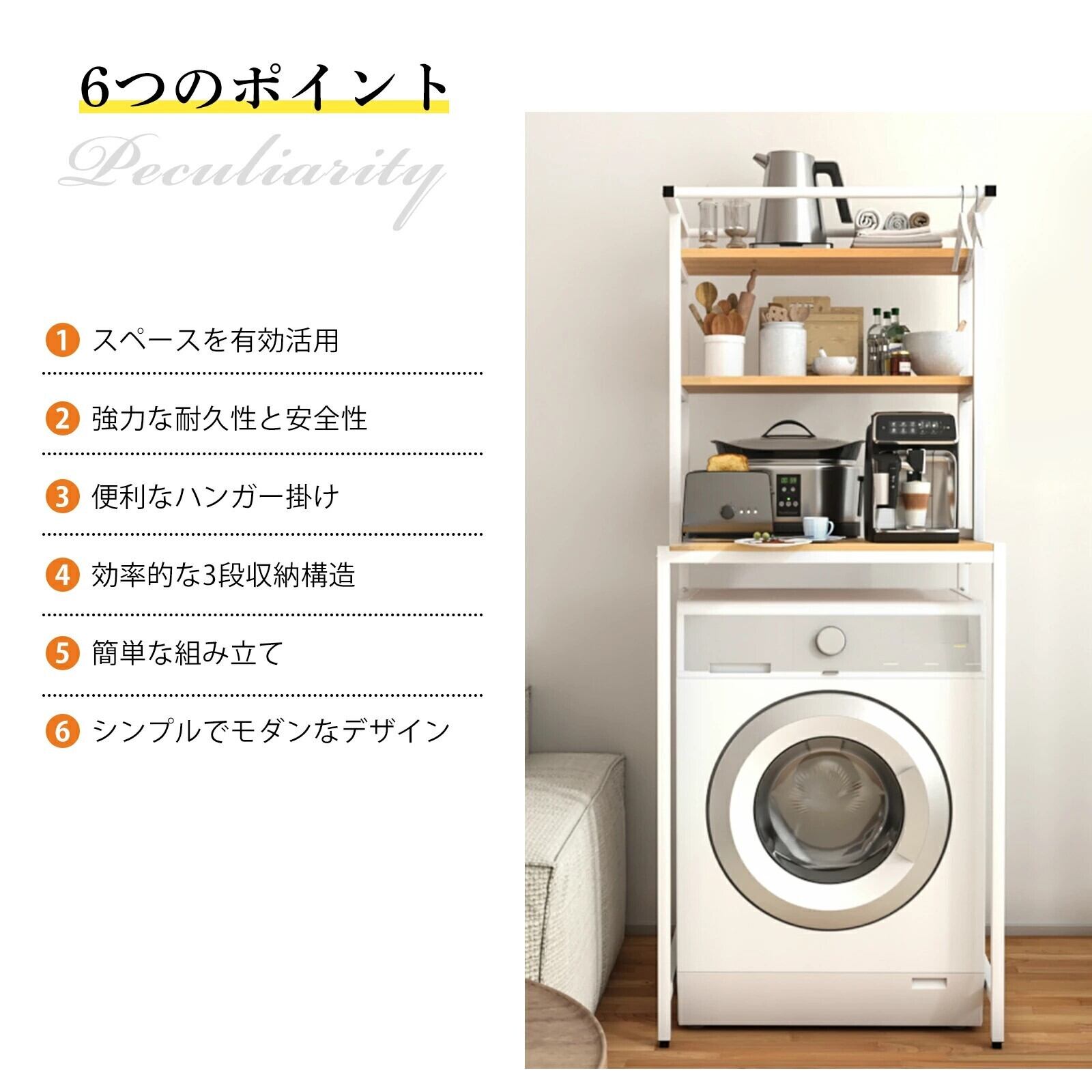 洗濯機をしっかりと支え、洗濯周りをスッキリと整理する機能を備えています!使いやすい形状で、洗濯機まわりのスペースを有効活用できること間違いなしです。これを設置すれば、洗濯がより効率的になり、日常の家事が楽しくなることでしょう!あなたの洗濯スペースに欠かせないアイテムとして、ぜひお迎えしてください!