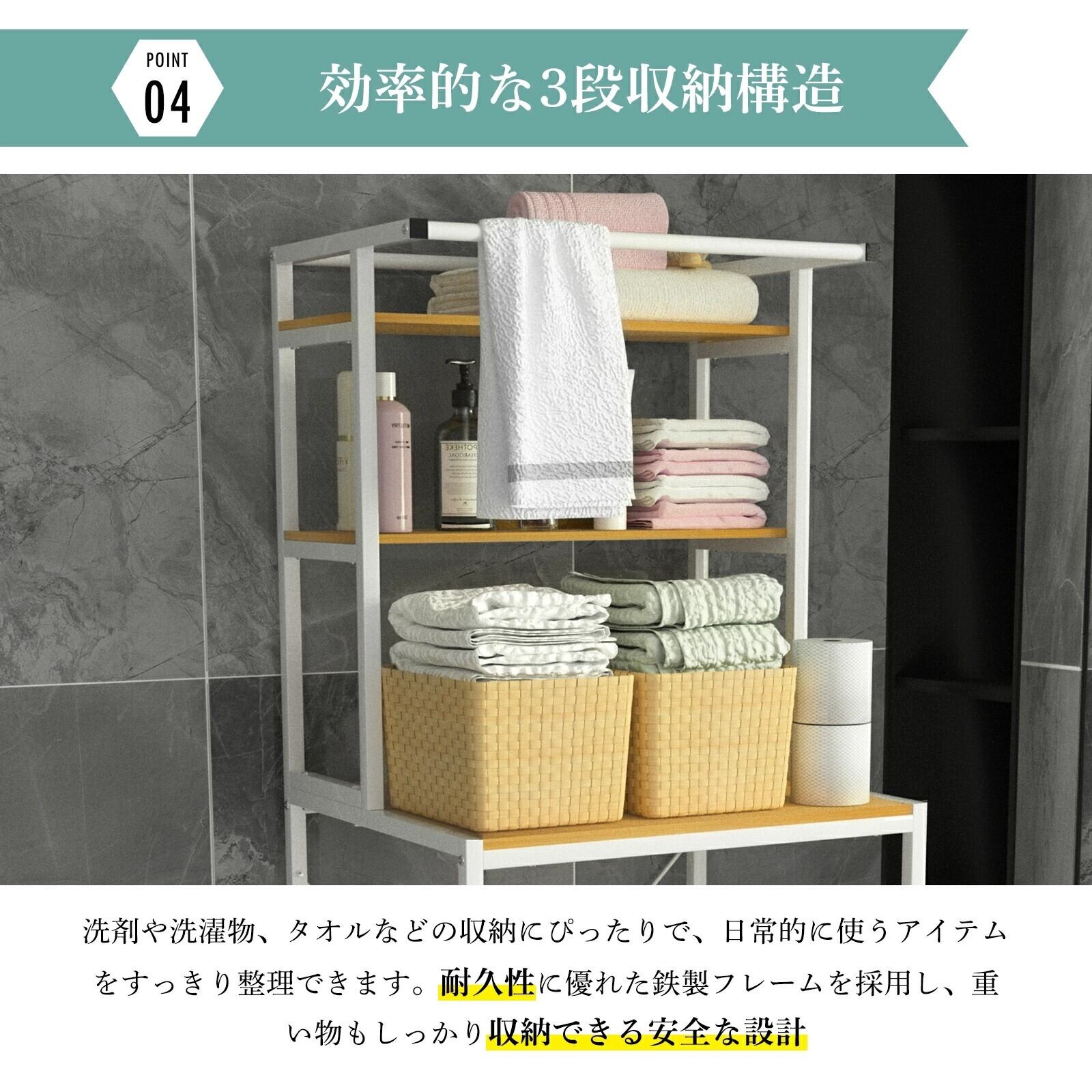 この洗濯機ラックは、機能性とデザイン性を兼ね備えた、便利なアイテムです。安定感のある構造で、長く安心してご使用いただけます。