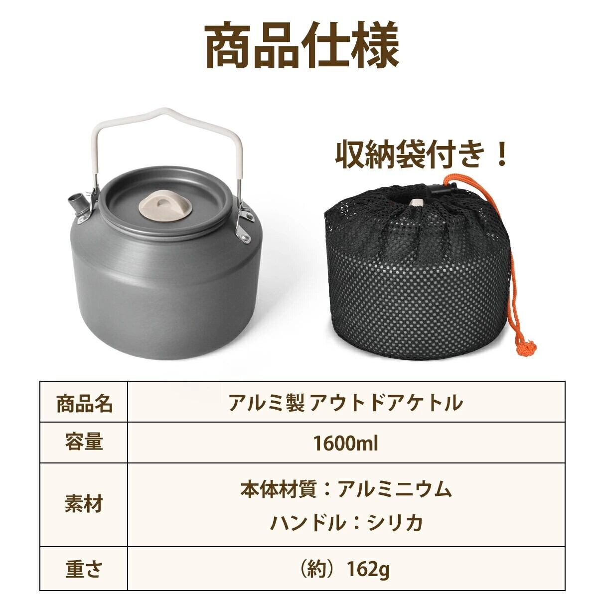 熱伝導が良く、水を素早く沸騰させる機能を備えています!耐久性に優れた素材で作られており、アウトドアシーンの過酷な条件にも対応。これを使えば、野外での飲み物や料理の準備がスムーズになり、自然の中での時間をもっと楽しむことができるでしょう!あなたのアウトドアライフを充実させるためのパートナーとして、ぜひお迎えしてください!